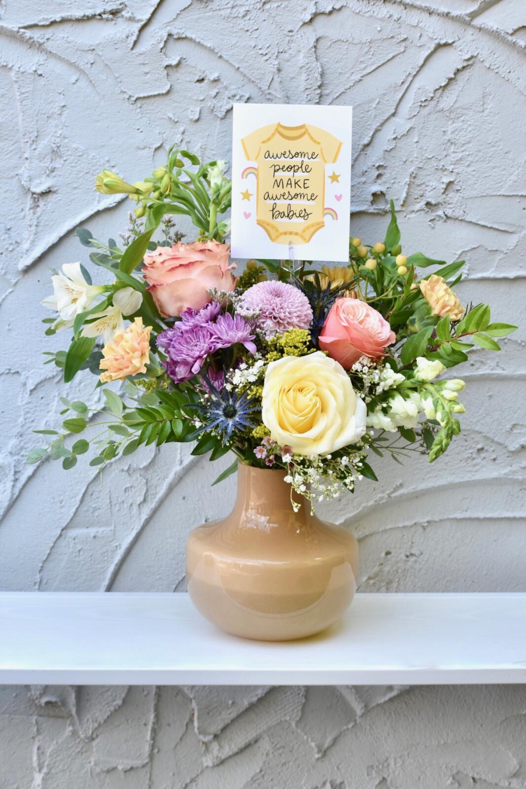 “Celebrate new life with Welcome Baby!—an elegant vase arrangement paired with a pacifier clip, rainbow teether charm, and our lovely “”mom canister””. Wrapped in Isidora’s signature gift style for a wow effect, it’s the sweetest way to mark the occasion.