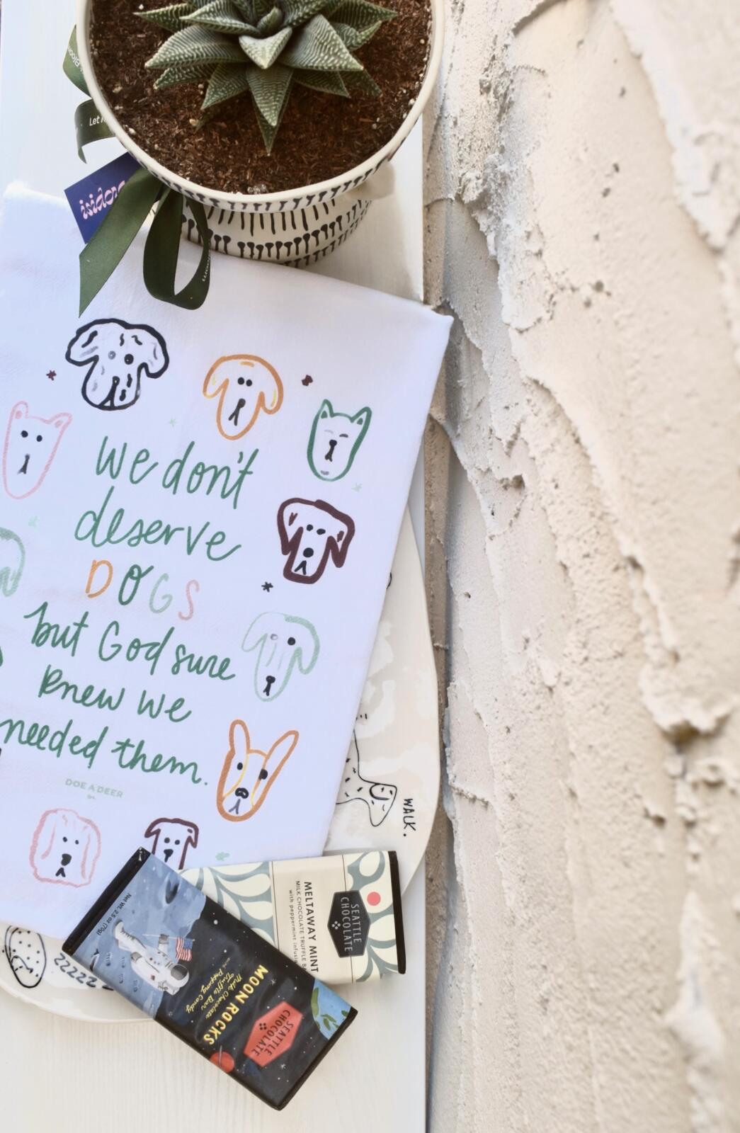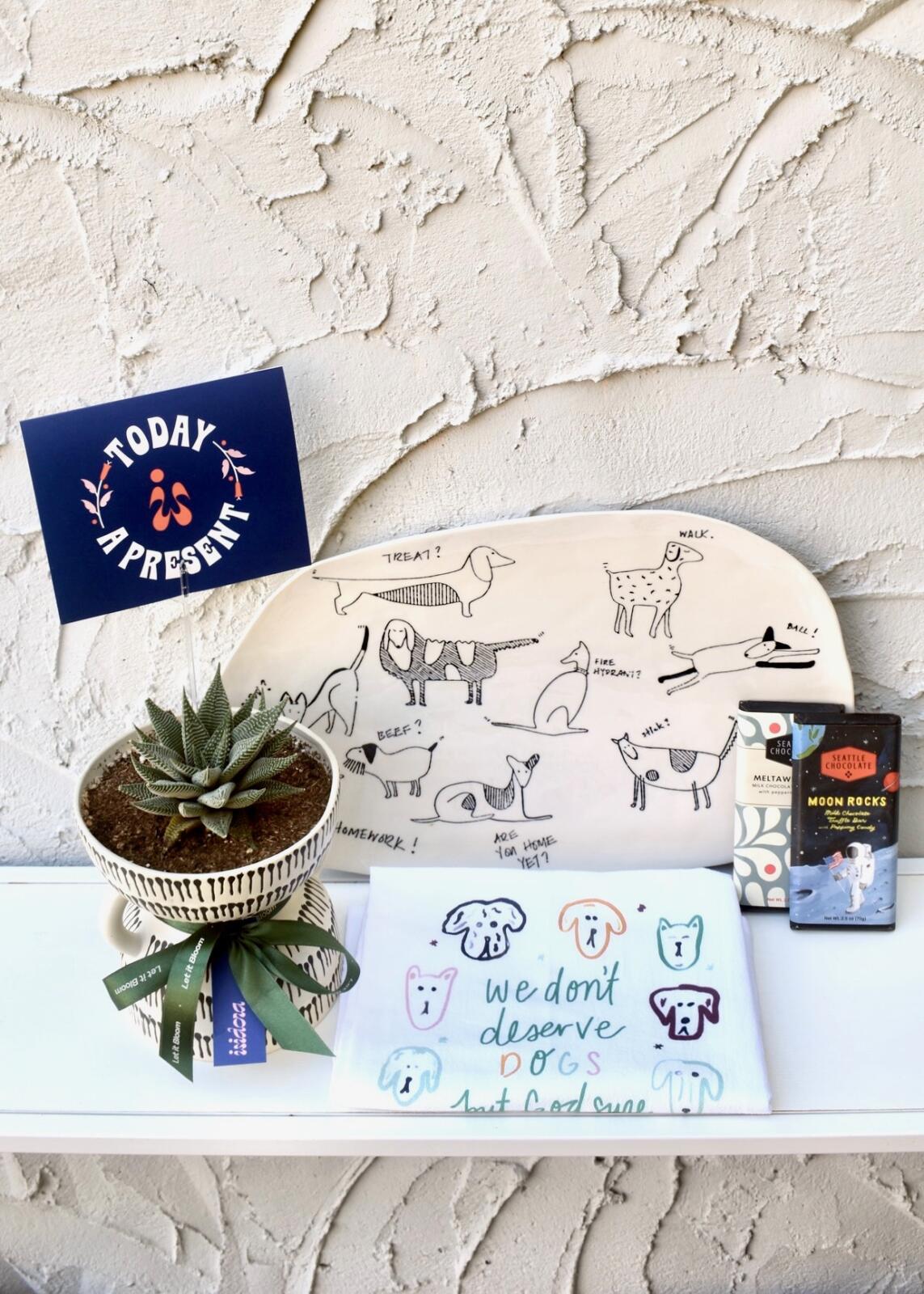 “Pawsitively charming: Succulent Haworthia (pet friendly), a unique dog-themed plate, a dog tea towel, and two Seattle chocolates. Wrapped in Isidora’s signature gift style for a wow effect.