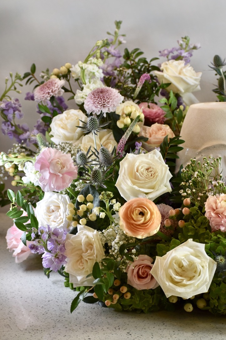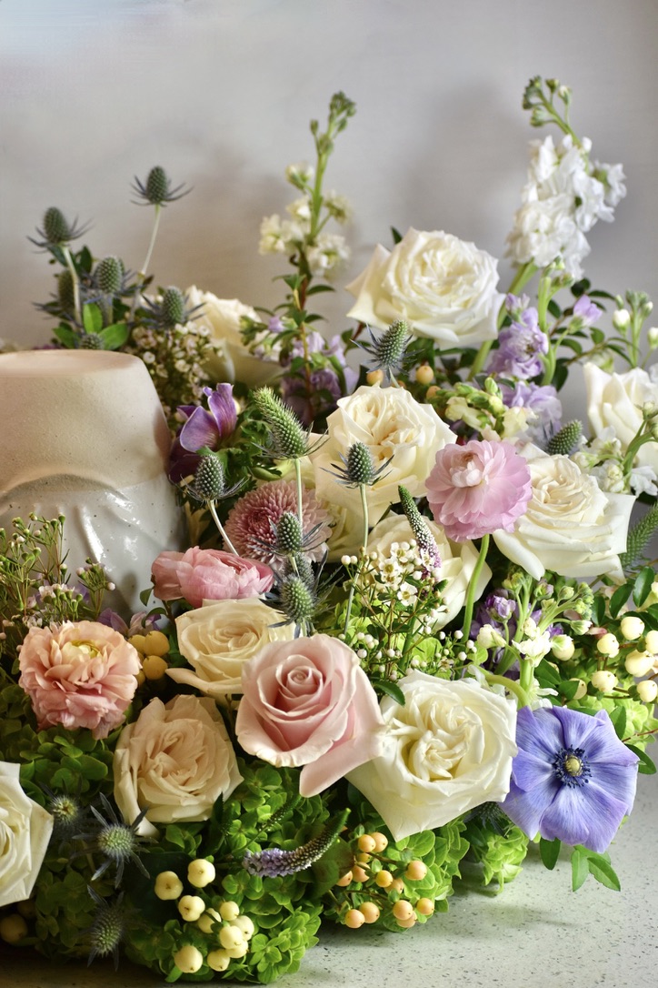 “High-end and garden-inspired, Tranquil Garden features specialty blooms in pastel tones. Designed to stand out with refined elegance, it is a beautiful way to celebrate life.